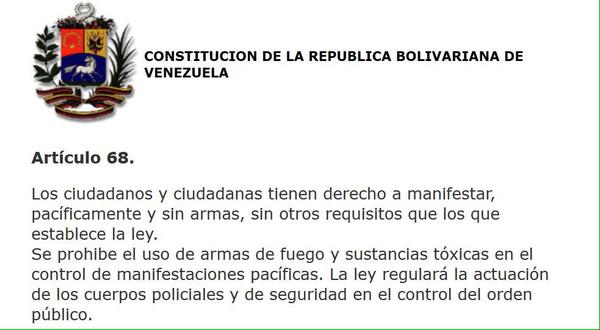 Creo que mas claro no se puede explicar, pues soy del que pienso que la cosntitución no se interpreta sino solo se cumplen sus artículos. Ahora bien en el día de ayer según gaceta oficial 40.589,si es que esto es cierto tenemos que hablar de supuestos, en la resolución 008610 en su artículo 5 que habla d la actuación de las Fuerzas Armadas y en su punto 5 se destaca lo siguiente: Uso progresivo y diferenciado de la fuerza: el uso de la fuerza por parte de las FANB, los funcionarios y funcionarias militaresen los precedimientos dirigidos a grantizarel orden público,la paz social y la convivencia ciudadana en reuniones públicas y manisfestaciones,se rige por los principios de legalidad,necesidad y proporcionalidad,utilización de la escala progresiva en función de la resistencia y oposición,seguimiento,supervisión,entrenamiento y difusión amplia de manuales,debiendo tener siempre el menor nivel de uso de la fuerza posible para el logro del objetivo propuesto. Hasta este punto vamos bien,peerooo, que vaina que siempre haya un pero, bueno continuando con el mismo punto: La dosis de fuerza aplicar deberá tomar en consideración una progresión en el comportamiento de las personas y la proporcionalidad con cada uno de los grados de intensidad,de modo que ntre la disuación y la reacción se gradúe la fuerza partiendo de la presencia ostensiva,hasta el uso del arma del fuego. Los funcionarios y funcionarias militares deberán emplear el menor nível de fuerza posible para el logro del propósito encomendado.